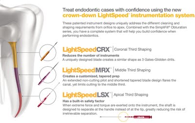Only True Crown down system, all other crown down systems do only 2/3 of the job, none of the systems except Smart Endo does a 100% job. Canal anatomy is different in the coronal, middle and apical third. The three instrument shapes in the LightSpeed system are custom designed to address these differences, enabling optimal and efficient cleaning and shaping from orifice to apex. CRX for coronal, MRX for middle third and LSX for apical third gives you at least 33% higher rates of success.